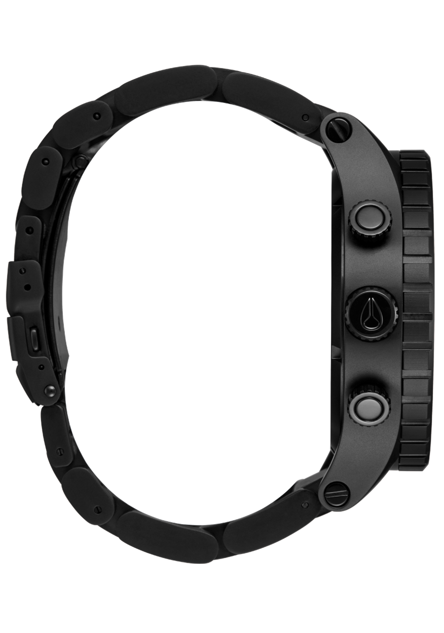 Cinque 13 segnano ogni ora intorno al quadrante, con un solo 13 luminescente. Quale? Beh, dipende da quale parte del mondo lo prendi. I pulsanti e la corona a vite si trovano sul lato delle 9 anziché delle 3 per prevenire "morsi al polso" durante l'uso attivo. Ghiera girevole unidirezionale per un timer analogico alla rovescia. Cronografo a sei lancette con timer di 24 ore e sottoquadranti del timer dei secondi, tutto in nero su nero.