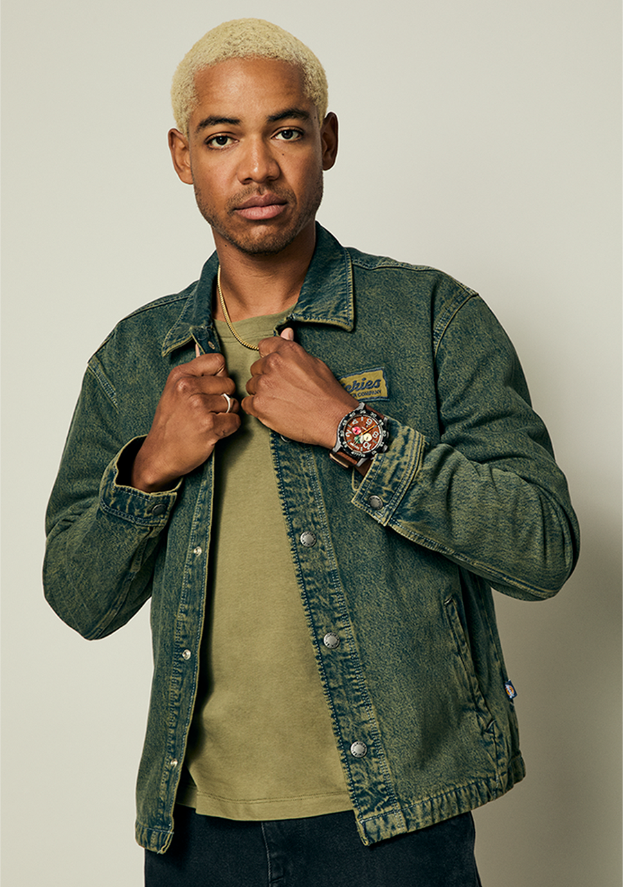 La corona e i pulsanti si trovano sul lato delle 9 invece che delle 3 per evitare il "morso del polso" durante l'uso attivo. Cronografo a sei lancette con subquadranti per timer di 24 ore e secondi.