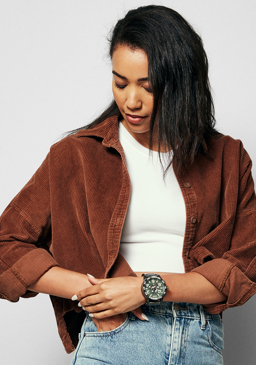 Il quadrante è circondato da una ghiera concava e presenta indici arabi e a bastone stampati in grassetto, una scala dei secondi stampata, contatori con texture CD e lancette sagomate su misura.