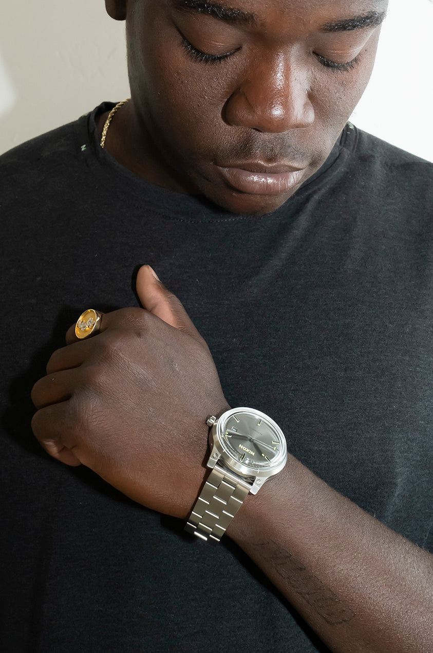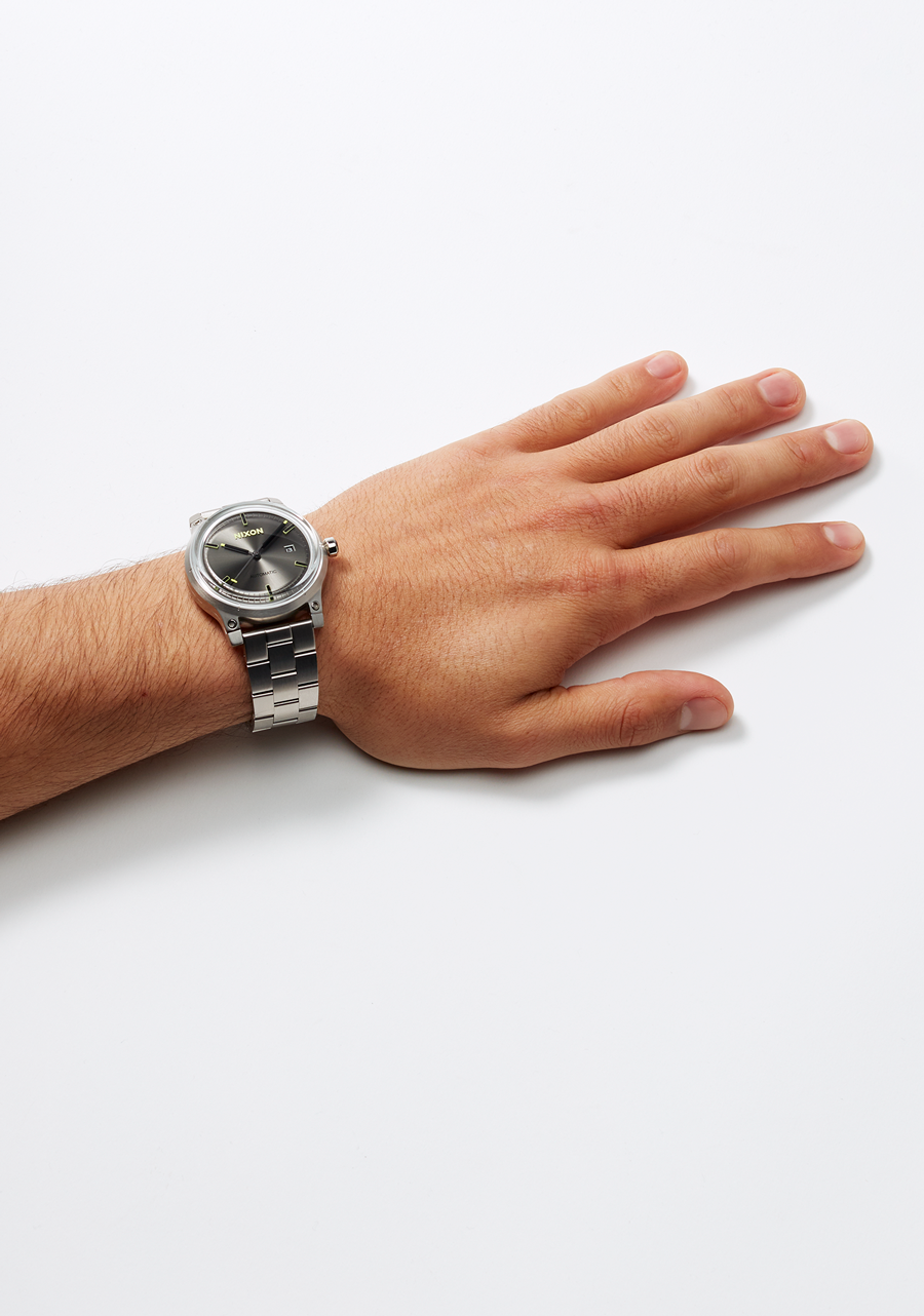 Cassa e bracciale in acciaio inox e vetro minerale temprato.