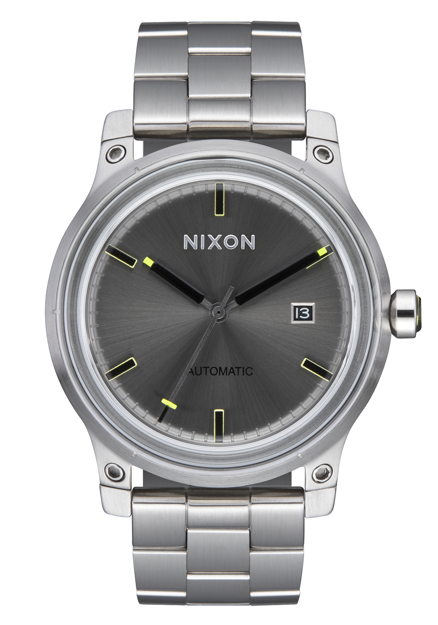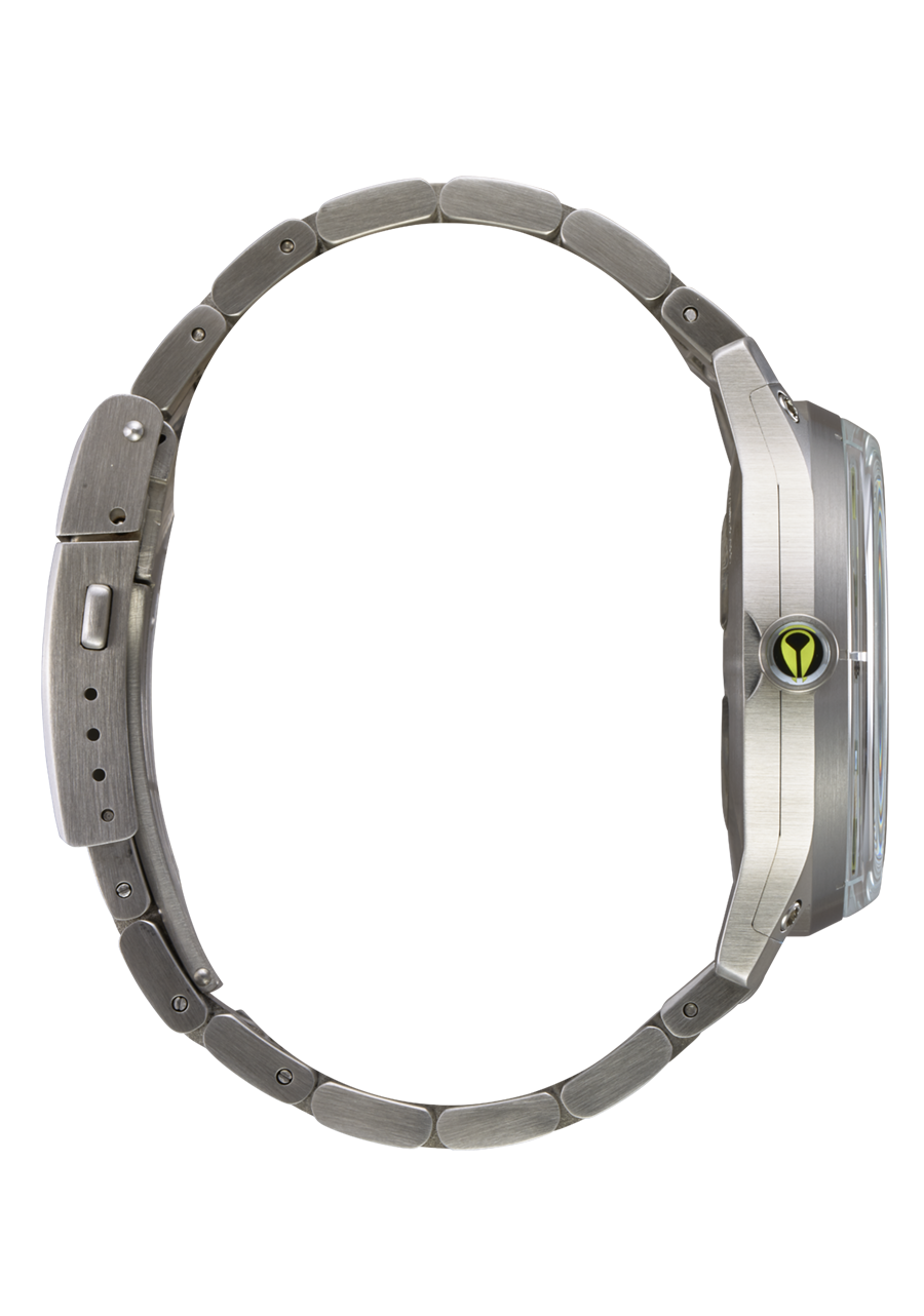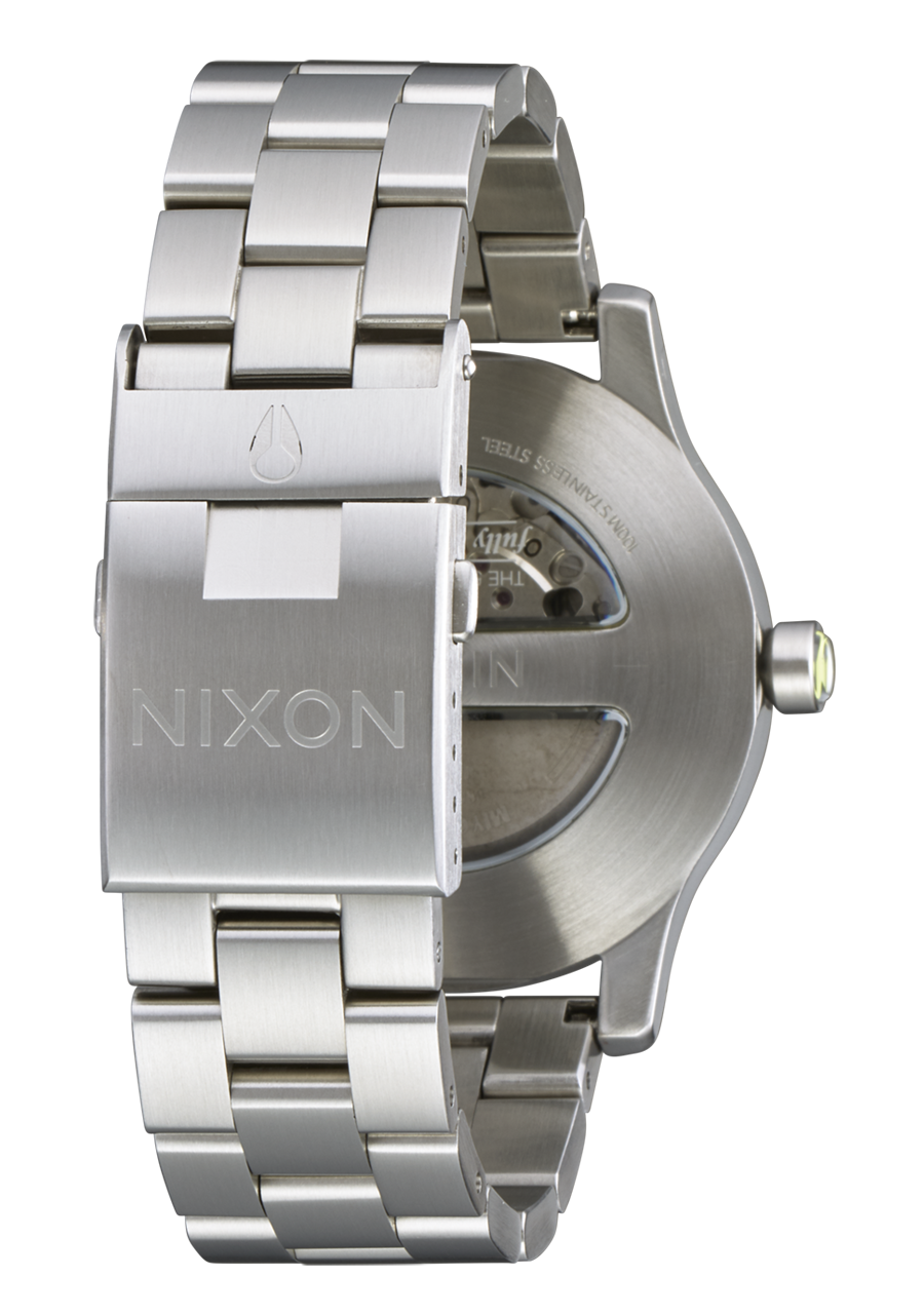 Cassa personalizzata in acciaio inossidabile massiccio da 42mm, 100M/10ATM. Design unico del vetro con bordi angolati. Costruzione della cassa a doppia apertura con fondello a doppia finestra.