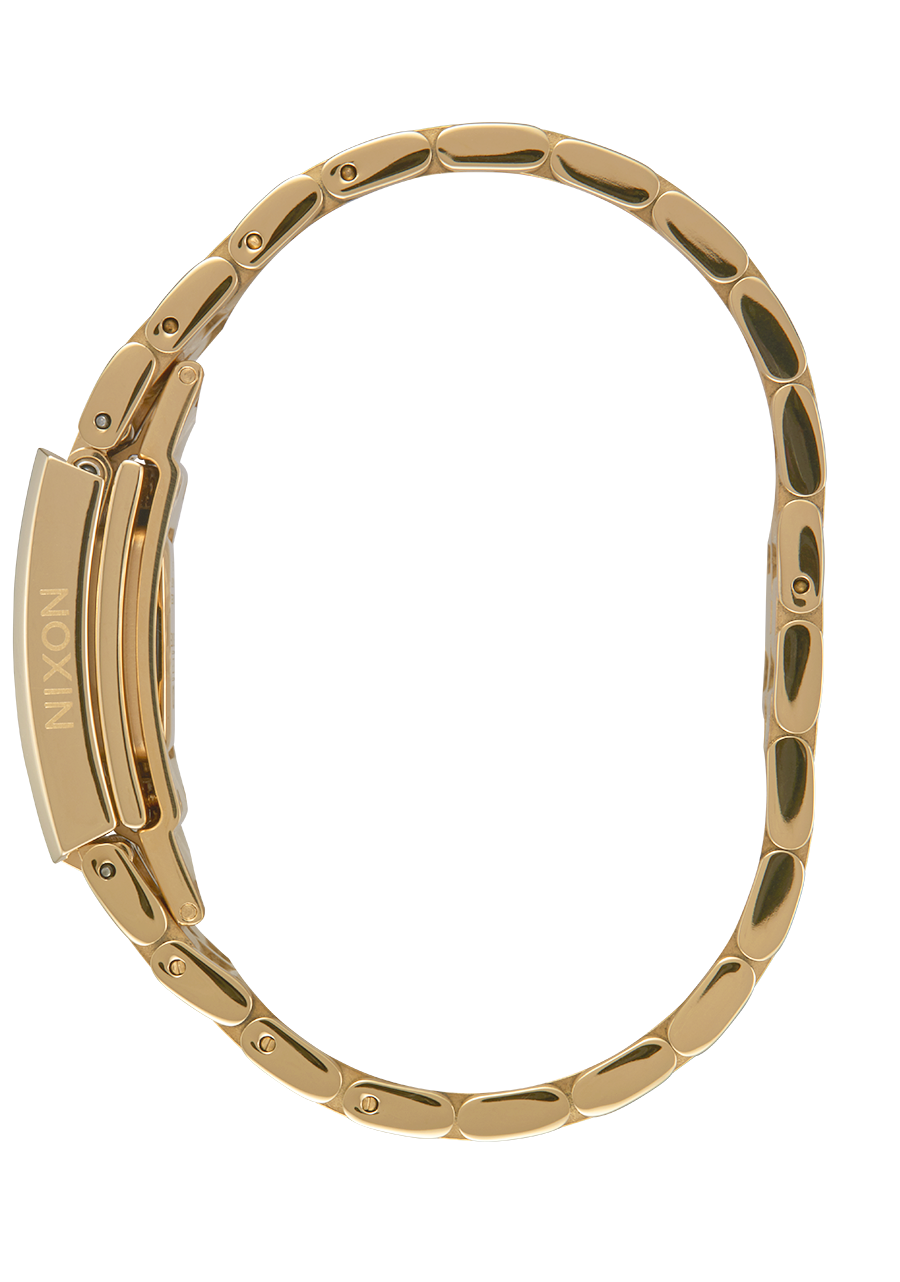 Cassa in acciaio inox da 23 mm con resistenza all'acqua di 30 metri / 3 ATM. Include un vetro minerale indurito, corona lucida con scanalature accentuate e ali Nixon incise sul lato. Dotato di fondello avvitato in acciaio inox.