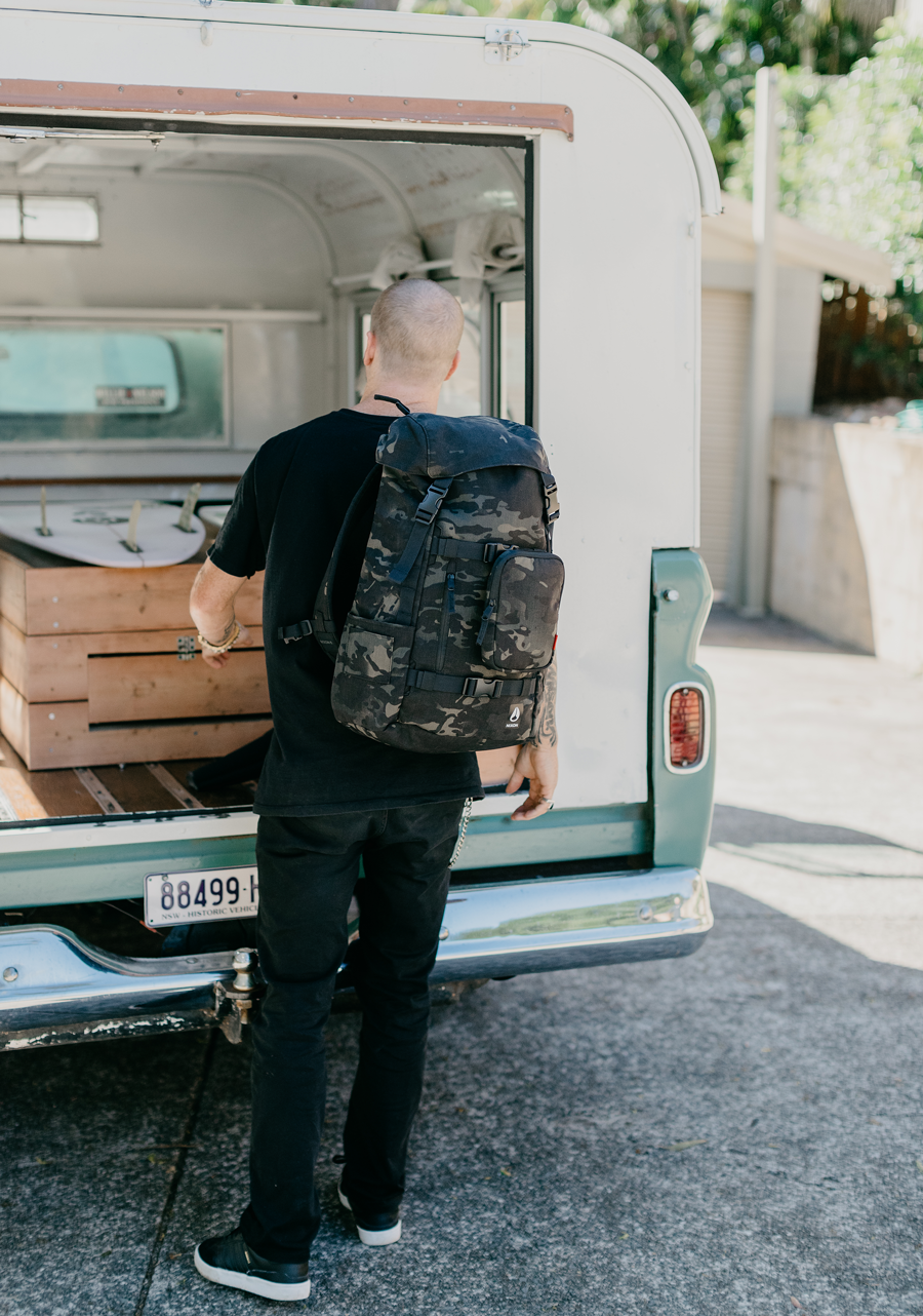 A slightly larger (30 liter) version of our loading all terrain backpack with a side entry laptop compartment and large main compartment with accessory slips and plush lined watch pocket. Has a top loading back panel tablet stash, vertical front panel pocket. Hide away skate straps, and side panel hydration slips. Also sports our modular pod system.