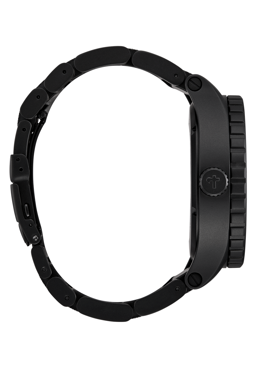 La corona si trova sul lato delle 9 invece che alle 3 per evitare il "morso del polso" durante l'uso attivo. Lunetta girevole unidirezionale per un timer analogico di conto alla rovescia.
