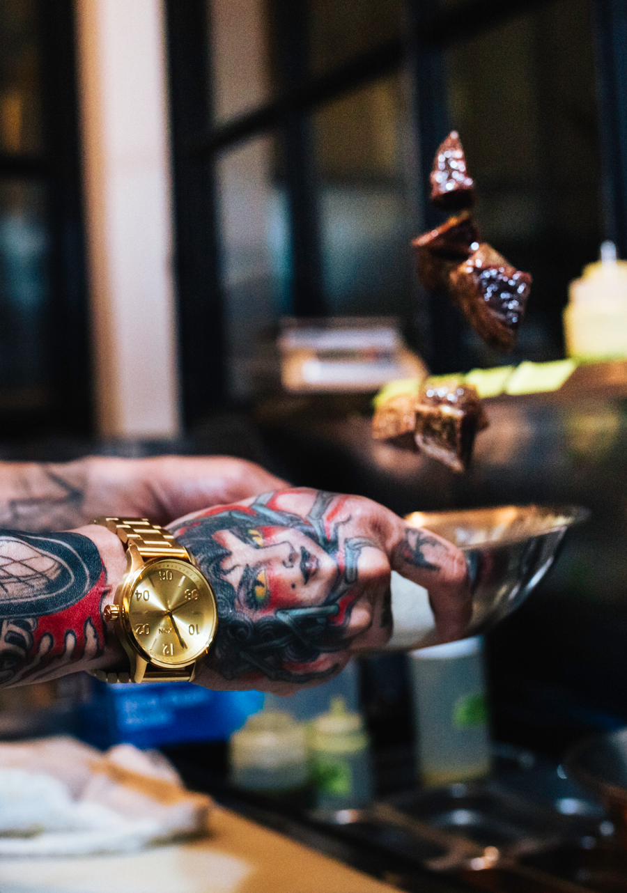 Il quadrante presenta indici arabi applicati e a bastone e una scala dei secondi stampata con lancette sagomate su misura.