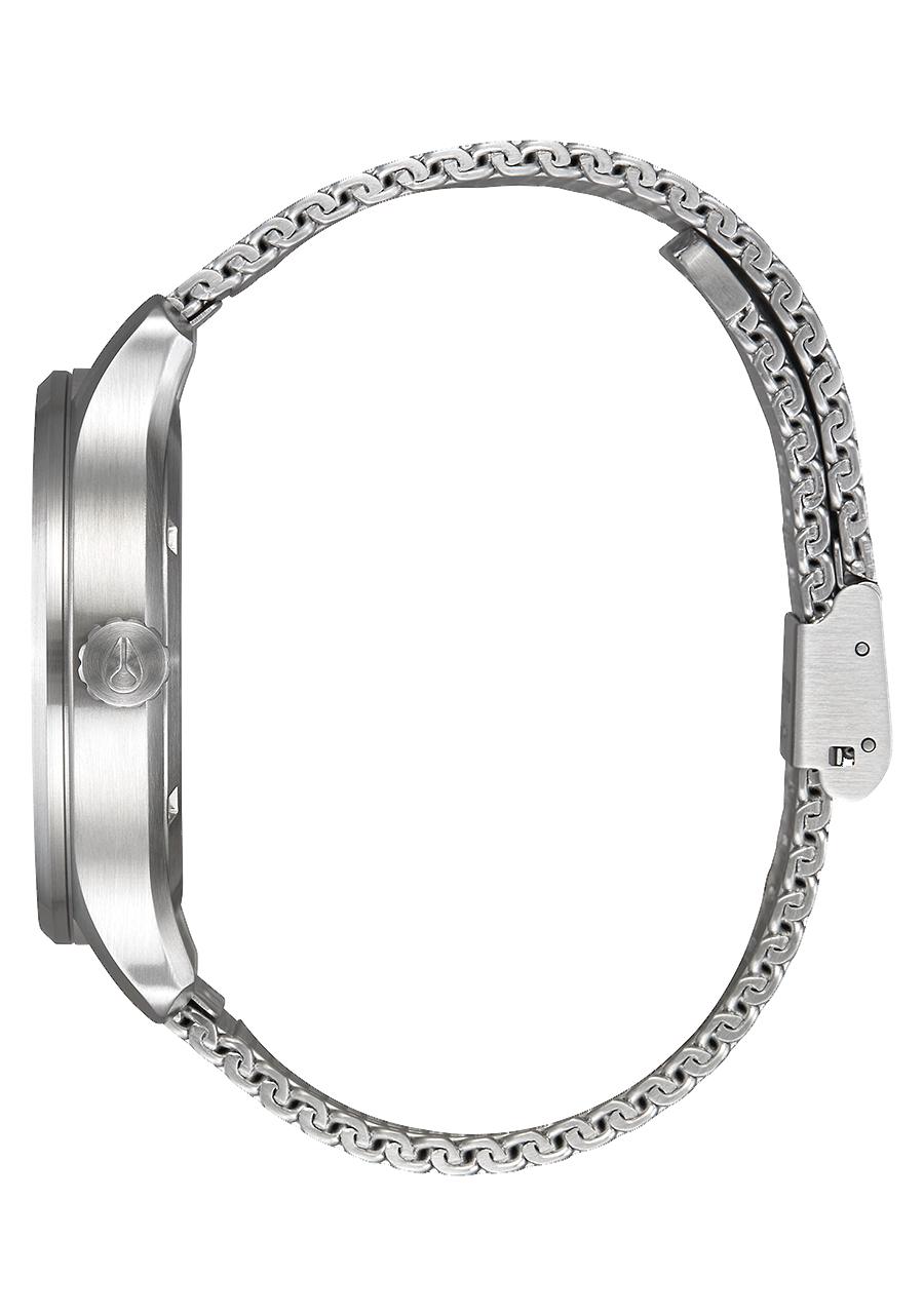 Cassa personalizzata in acciaio inossidabile massiccio da 42 mm con resistenza all'acqua di 100 metri / 10 ATM. Dotata di vetro minerale indurito, fondello avvitato in acciaio inossidabile e anse con perni a molla.