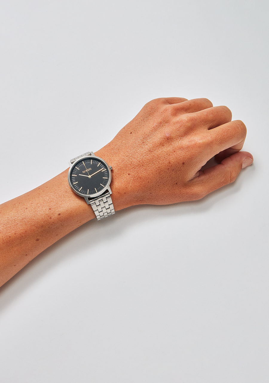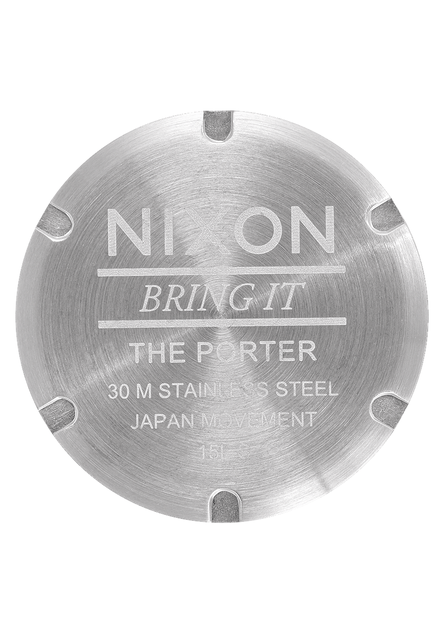 The Nixon Porter features a custom stainless steel case and bracelet. The watch is designed for everyday durability, with a hardened mineral crystal, double gasket crown, and screw-down stainless steel caseback for enhanced protection.