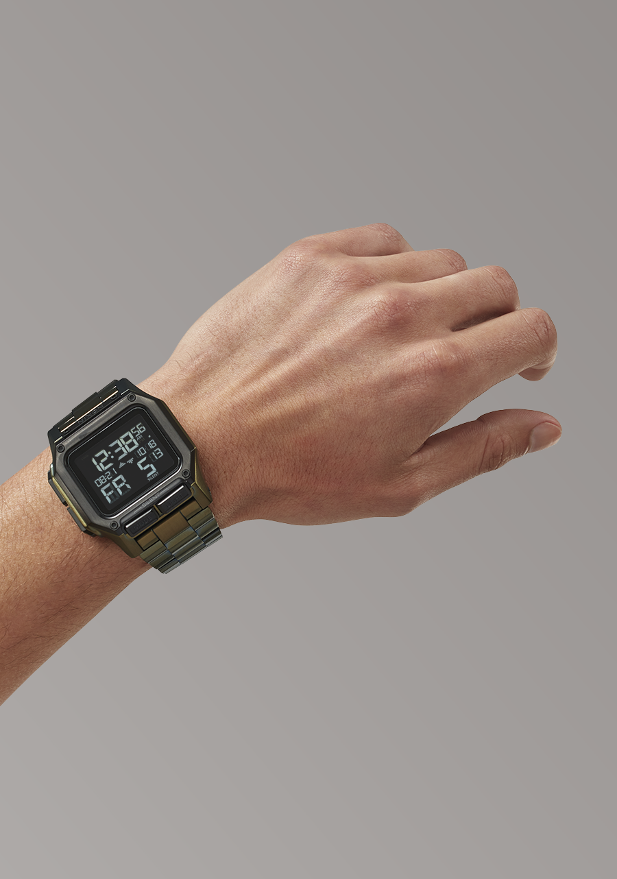 Modulo digitale LCD personalizzato racchiuso in una custodia protettiva in PU e imbottitura in schiuma Poron per un'assorbimento degli urti e una durata super resistenti. Le funzioni includono doppio fuso orario, ora del giorno (12 o 24 ore), giorno/data, calendario automatico fino al 2099, doppi cronografi con risoluzione di 1/100 di secondo visibili da tutte le schermate, timer conto alla rovescia, 3 allarmi indipendenti, retroilluminazione LED regolabile e modalità silenziosa.