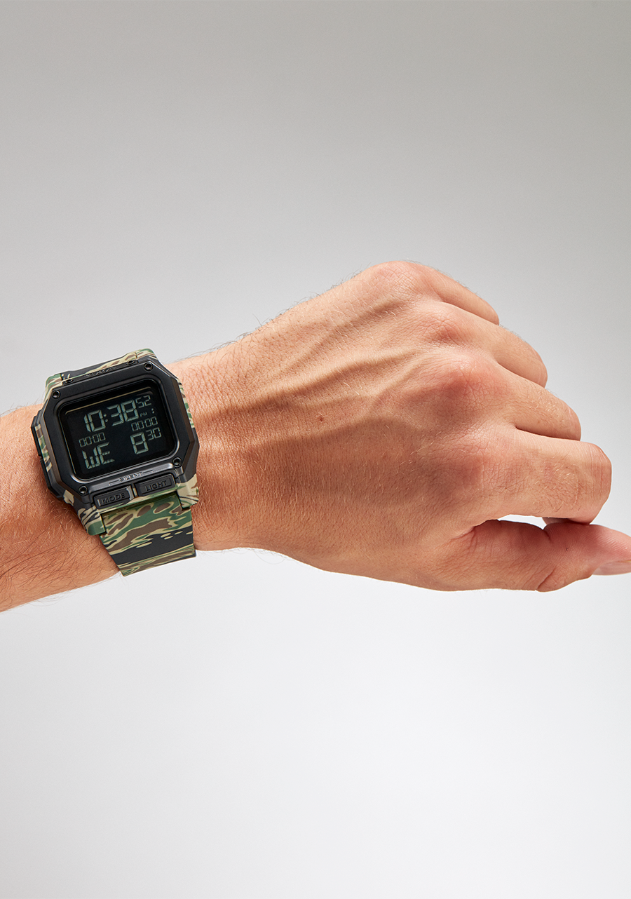 Modulo digitale LCD personalizzato racchiuso in una custodia protettiva in PU e imbottitura in schiuma Poron per un'assorbimento degli urti e una durata super resistenti. Le funzioni includono doppio fuso orario, ora del giorno (12 o 24 ore), giorno/data, calendario automatico fino al 2099, doppi cronografi con risoluzione di 1/100 di secondo visibili da tutte le schermate, timer conto alla rovescia, 3 allarmi indipendenti, retroilluminazione LED regolabile e modalità silenziosa.