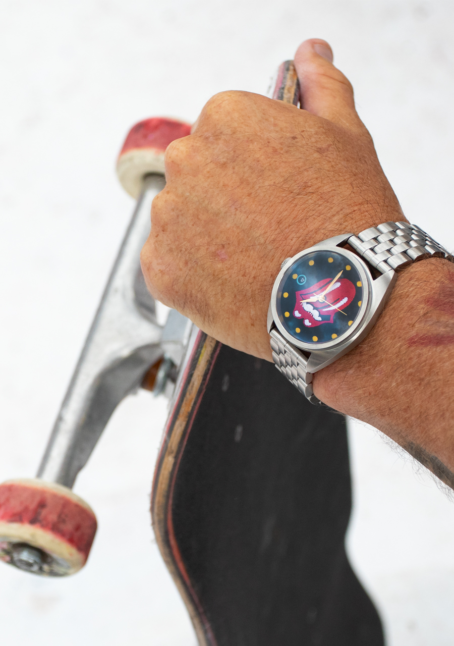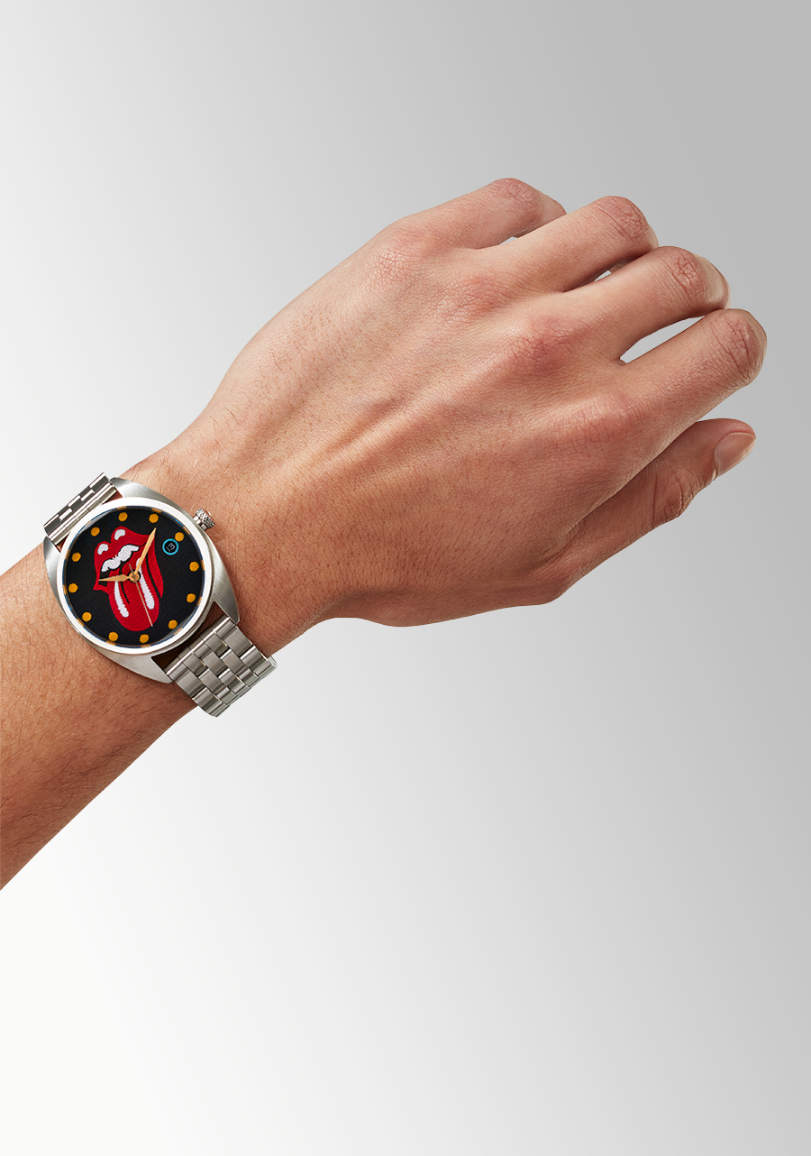 Il quadrante presenta indici applicati e lancette sagomate su misura. Presenta la classica lingua dei Rolling Stones, indici dorati orbitanti e una finestra della data evidenziata in blu.