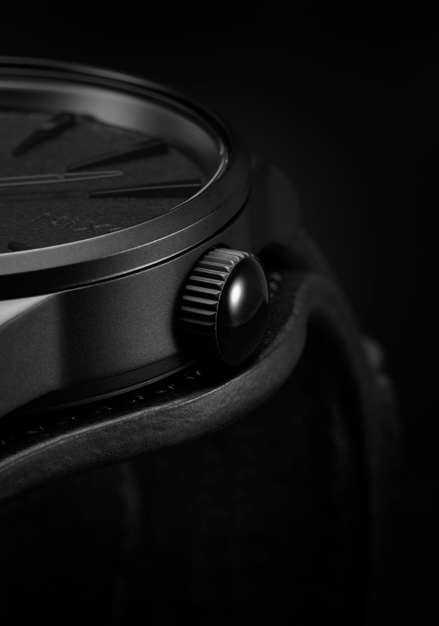 Cassa personalizzata in acciaio inossidabile massiccio da 42 mm con resistenza all'acqua fino a 100 metri / 10 ATM. Dotata di vetro minerale indurito, corona a tripla guarnizione con smalto, fondello avvitato in acciaio inossidabile e anse con perni a molla.