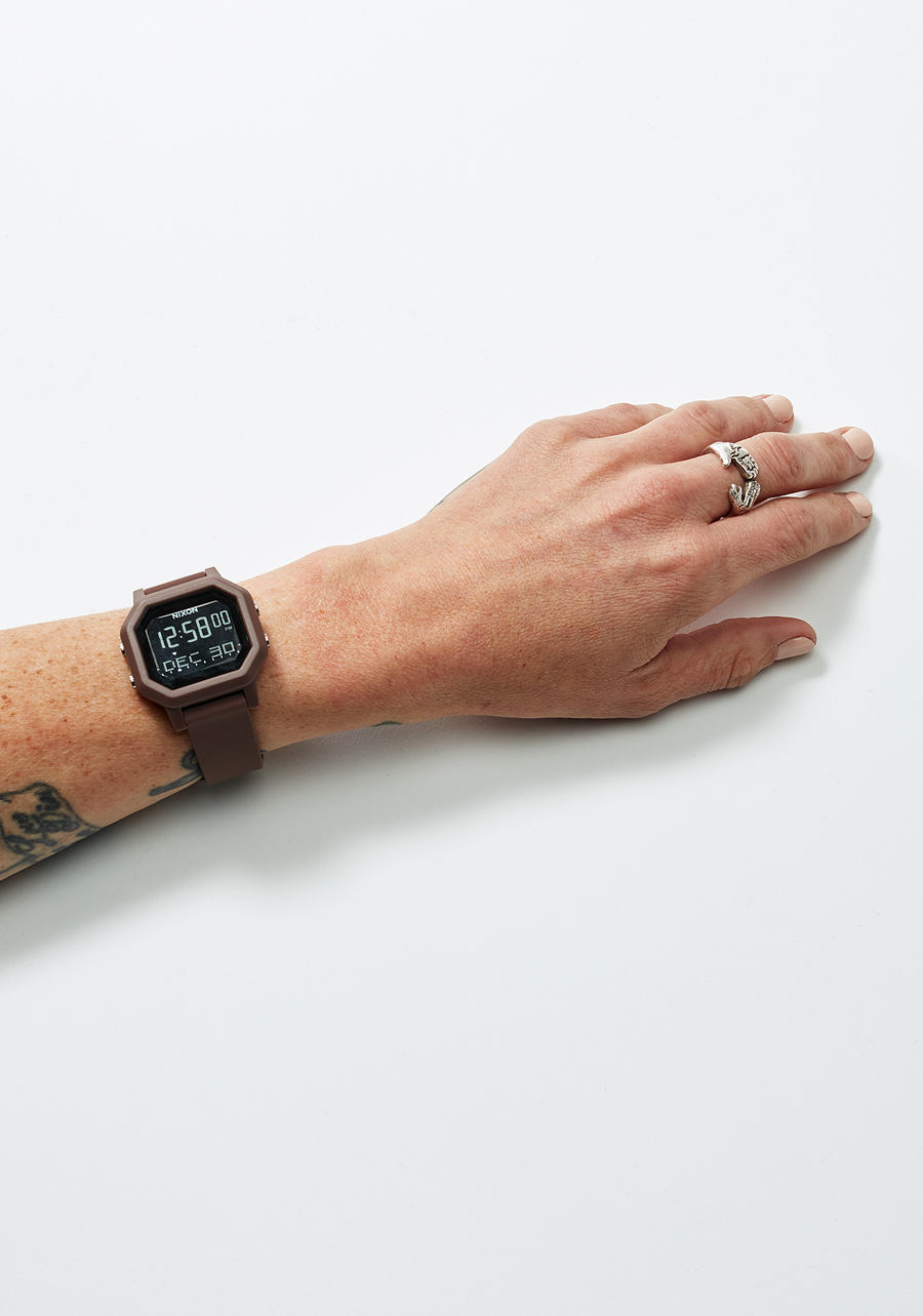 Cassa da 38 mm in plastica oceanica riciclata rinforzata, stampata a iniezione su misura, con resistenza all'acqua di 100 metri / 10 ATM. Dotata di pulsanti personalizzati in acciaio inox con guarnizione, fondello avvitato in acciaio inox e anse a barra avvitata in acciaio inox.