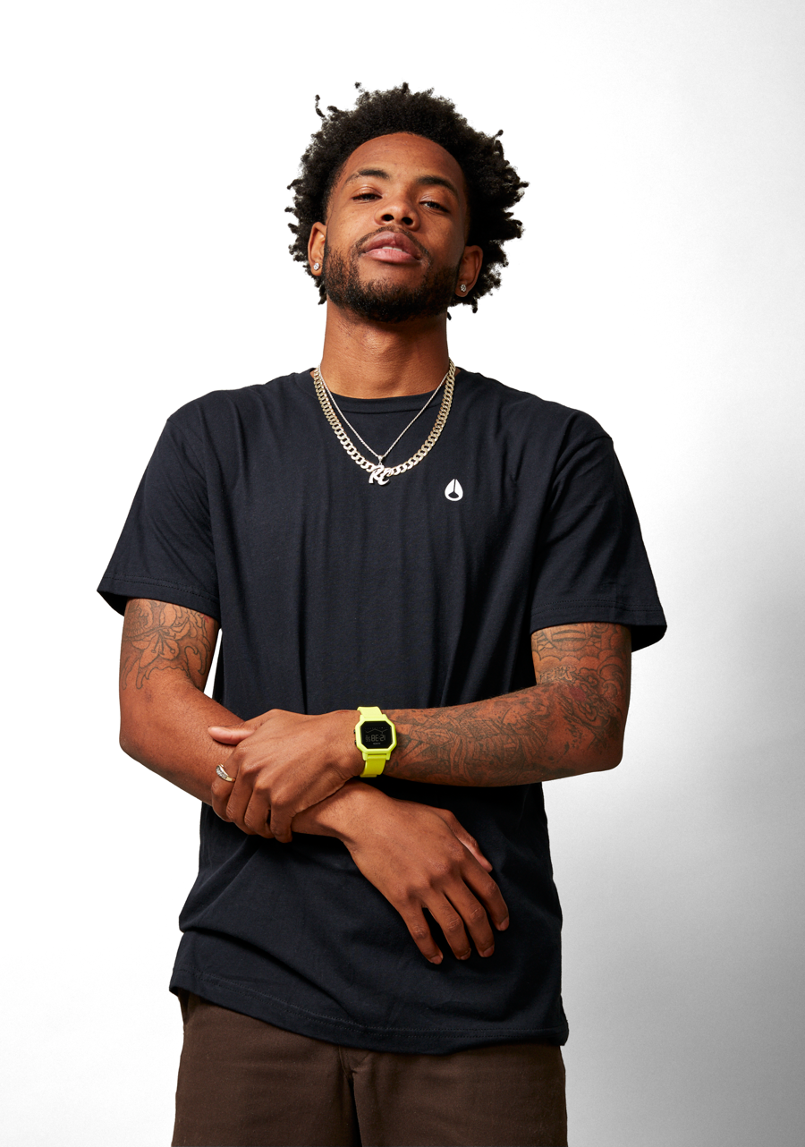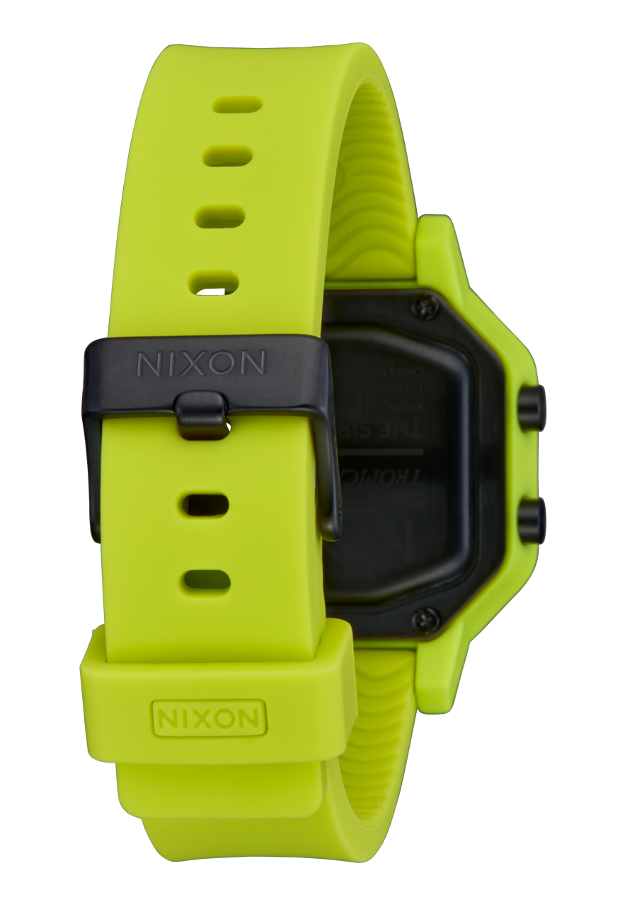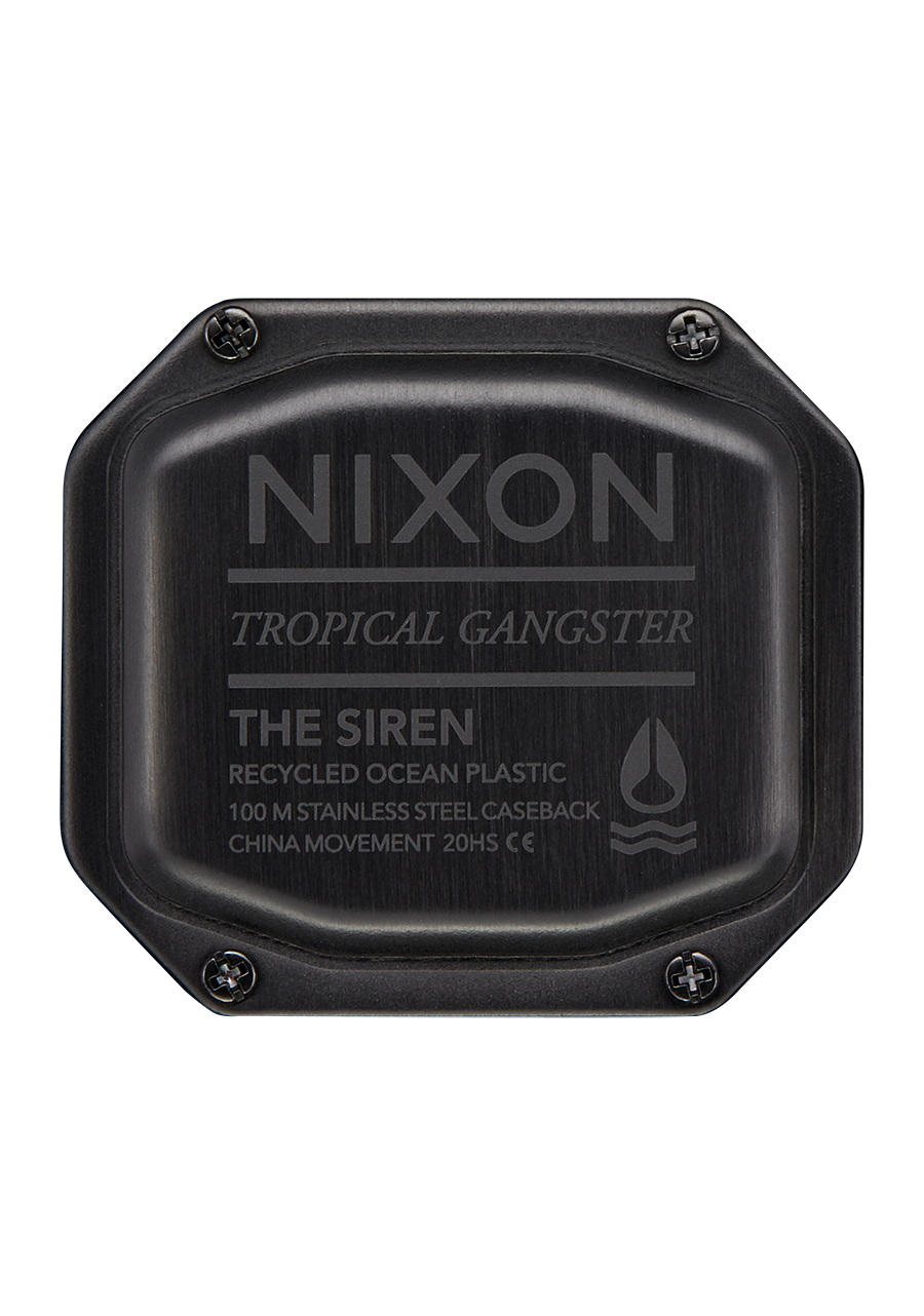 Cassa da 38 mm in plastica oceanica riciclata rinforzata, stampata a iniezione su misura, con resistenza all'acqua di 100 metri / 10 ATM. Dotata di pulsanti personalizzati in acciaio inox con guarnizione, fondello avvitato in acciaio inox e anse a barra avvitata in acciaio inox.
