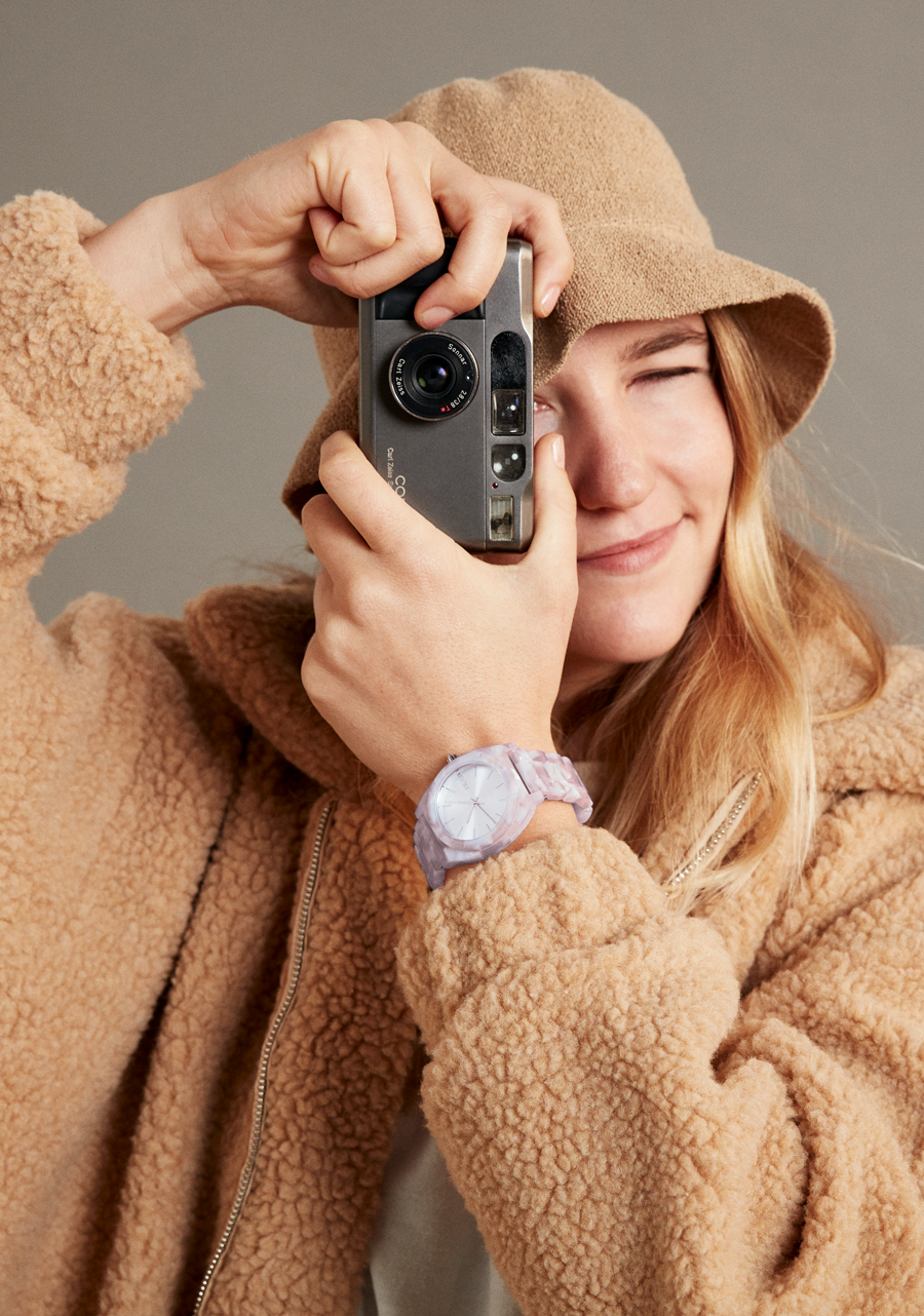 Cassa in acetato fatta a mano personalizzata da 40 mm e lunetta fissa con resistenza all'acqua di 100 metri / 10 ATM. Dotato di vetro minerale indurito, corona in acciaio inox con tripla guarnizione, fondello avvitato in acciaio inox e anse con perni a molla.