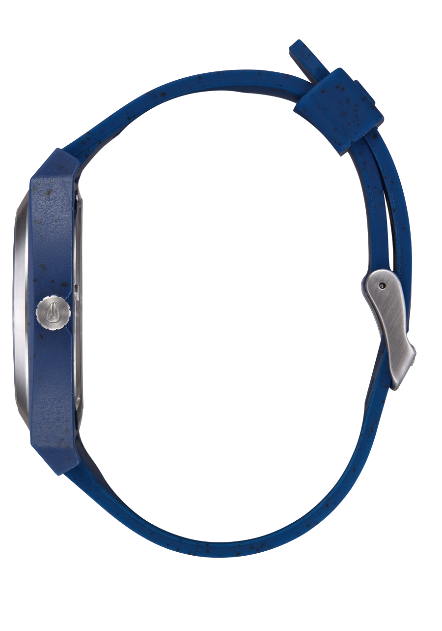 Cassa in plastica riciclata da 39,5 mm e lunetta fissa in acciaio massiccio con resistenza all'acqua di 100 metri / 10 ATM. Dotato di vetro minerale indurito, corona in acciaio inox con tripla guarnizione, fondello avvitato in acciaio inox e anse con perni a molla.